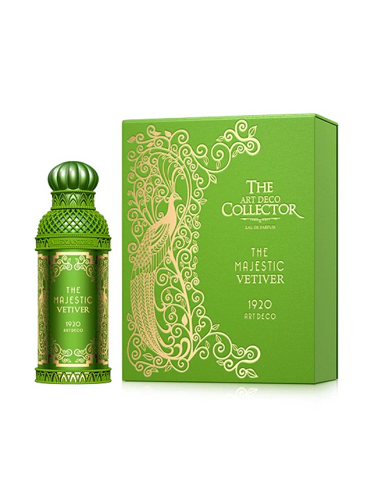 Le packaging primaire de la collection Art Déco est unique grâce à son design et ses couleurs raffinées. Majestic Vetiver se présente dans un somptueux flacon vert aux détails réalisés en maille ajourée qui rappellent le voile porté en signe de respect par les femmes de rang supérieur à cette époque. Le capot vert avec ses lignes courbées rappelle les meubles de style arts déco ; Les motifs géométriques sont contrebalancés par des arabesques. Le packaging secondaire est constitué d’une boîte verte en soie accessoirisée.