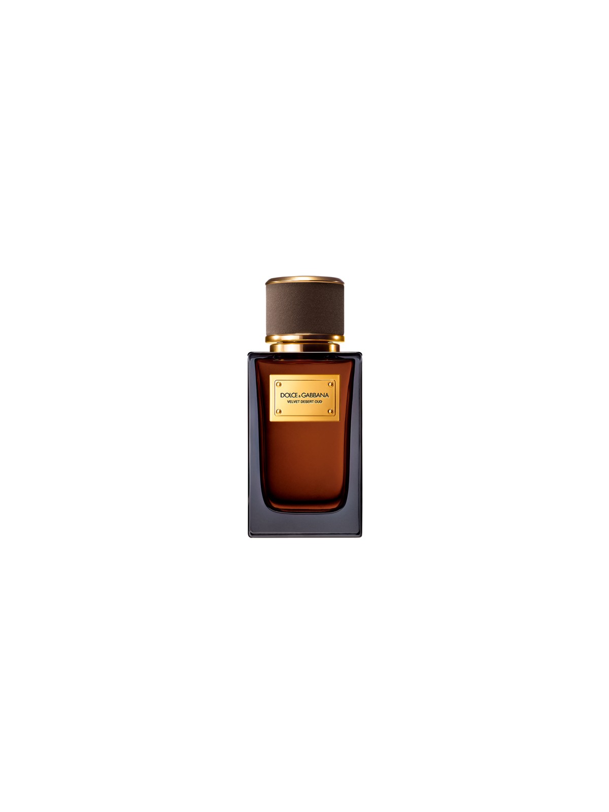 Le flacon iconique en verre épais de la collection Velvet de Dolce&Gabbana est rehaussé pour Dolce&Gabbana Velvet Desert Oud Eau de Parfum d'un bouchon en velours brun fumé avec des détails dorés.